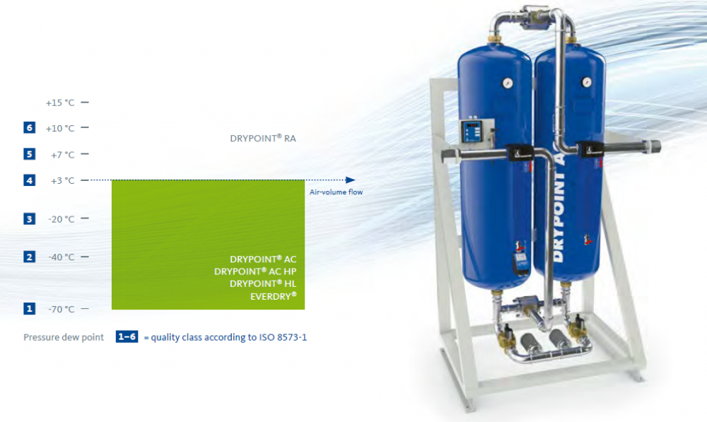 Osuszacze te w porównaniu z chłodniczymi dają punkt rosy określony w przedziale od - 200C do nawet -700C. Są przeznaczone wszędzie tam, gdzie osuszacze chłodnicze nie spełniają wymagań. Koszty eksploatacji i zakupu osuszacza adsorpcyjnego w porównaniu do analogiczej przepustowości osuszacza chłodniczego jest wyższy. Przy doborze należy uwzględnić warunki pracy.